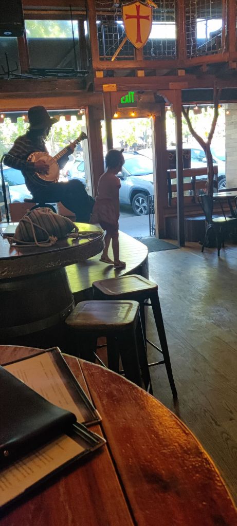 I thought of that as I watched a lovely young girl, daughter of a photographer shooting photos of the banjo player playing that Sunday afternoon (yes, I’ve moved on from Ashland, you can only hold down a bar stool and glass of mead for so long). People going about their lives (relatively) free to enjoy a drink, hear a banjo, watch a child dancing free. I wonder what would happen if enough people simply stopped going along with militarism or the expectation that we should “be productive” and only “play hard” after “working hard”?