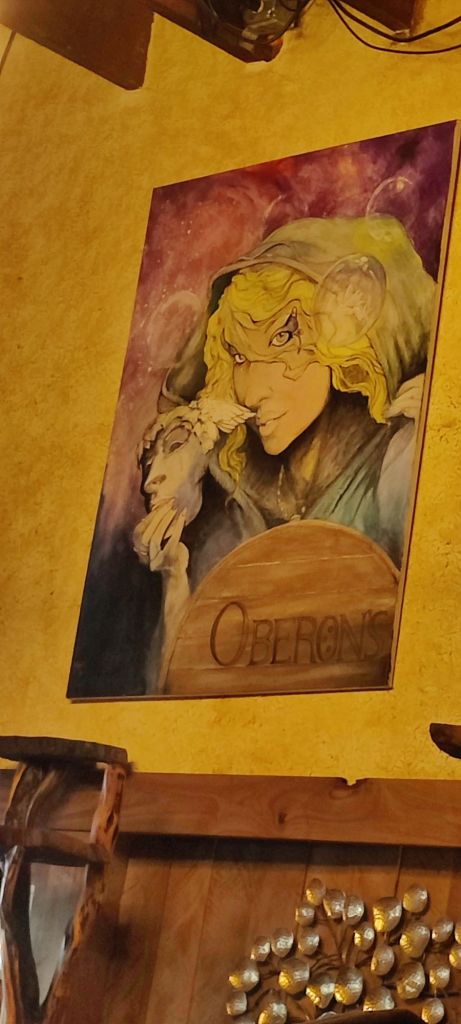 I’m back on the road sitting on a Sunday afternoon in a bar called Oberon’s Three Penny Tavern. I’ve been in Ashland for a few days, took in a great show,”Virgins and Villains”, about a woman’s self biography set in the roles she played in Shakespeare’s plays, I climbed onto the Mountain of the Rogue, a hiking trail looking over the Rogue River, walked along the River, and interspersed among the scripted lines of women in the Bard’s plays, walked the town, its parks, and became a local at Oberon’s. For a few days.